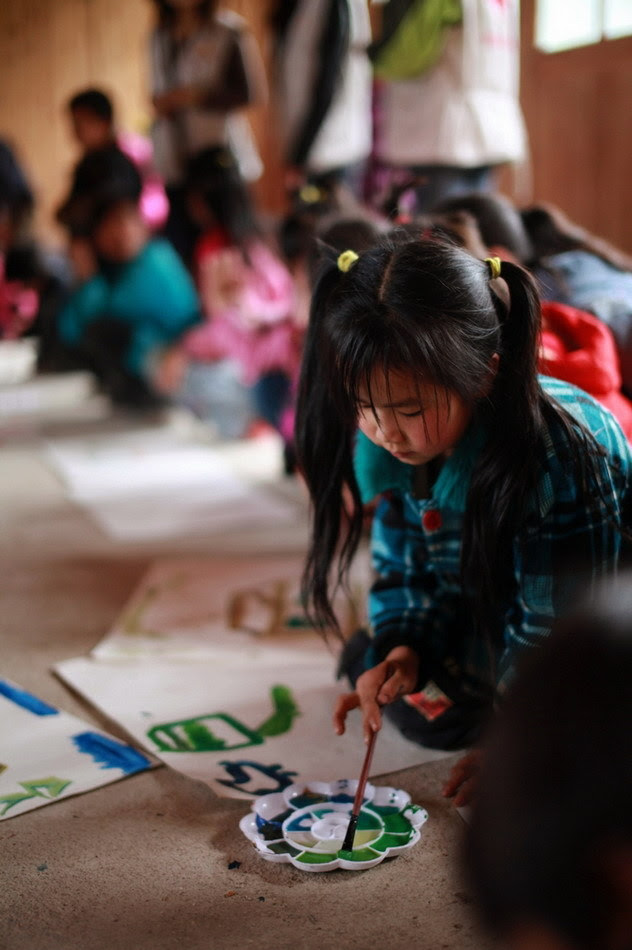 湖南新化县奉家镇横拉坪村快乐小学,志愿者为孩子们捐赠了油画笔和墨,同学们尽情的绘画起来。王立三摄
